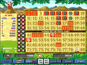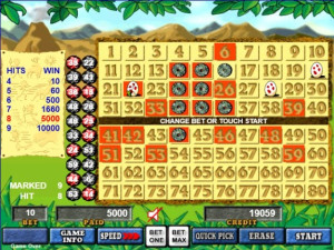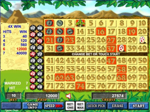 In Caveman Keno, 3 eggs appear on non-chosen spots after the player initiates game play. If 3 eggs turn into dinosaurs you are awarded 8 times the win amount. If 2 eggs turn into dinosaurs, earn 4 times the win amount.