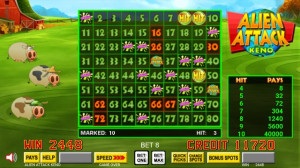Alien Attack Keno is a fun new keno game offering fighting cows, abducting aliens, instant credit prizes, free bonus games, and paytable multipliers. There's a special "Pick-a-Prize" bonus that lets you pick one of 19 tiles, three of which will award a free Alien Attack game bonus (the others award instant credits). The Alien Attack game bonus lasts until the last cow is abducted and includes multipliers up to 5X.